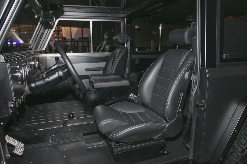 Rotational energy comes from two electric motors, one at each axle. Front and rear locking differentials allow for hard-core off-roading, as do the Portal hubs at each wheel and a fully independent suspension system. Heavy-duty, vent disc brakes with regenerative braking are mounted inboard of each half-shaft, meaning there is less unbalanced weight at each wheel. The suspension system is comprised of a double wishbone setup at each corner, sprung with adjustable airbags that raise and lower the ride height by 10 inches.
