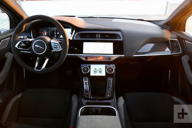 Inside, the I-Pace bucks a minimalist, future-forward approach for structures that will be more familiar to Jaguar drivers — perhaps maybe not EV drivers. A conventional gauge display is accompanied by a 12.3-inch touchscreen for infotainment and lower touchscreen for climate controls and vehicle functions. No floating dashes, pared bamboo, or sustainable sourced and edible plastics to be found.