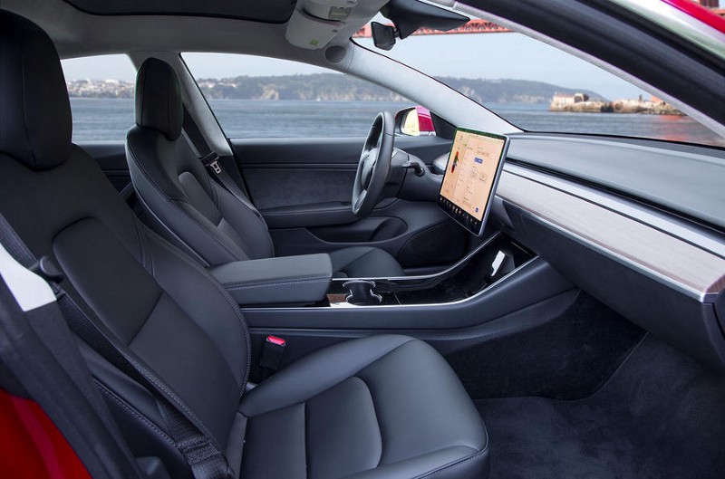 The Model 3 carries its heavy battery under the floor, resulting in a low center of gravity, and it has the front-to-rear weight distribution of a sports car. These two attributes help it change direction crisply and feel planted and stable in the corners. The steering is accurate and well weighted, with three different settings that adjust the level of steering effort: Comfort, Standard, and Sport. The ride is firm without being harsh; without the noise of a gas-powered engine to cover it up, however, you do hear plenty of noise inside the cabin as the tires thwack and thrum when driving over pavement imperfections.
