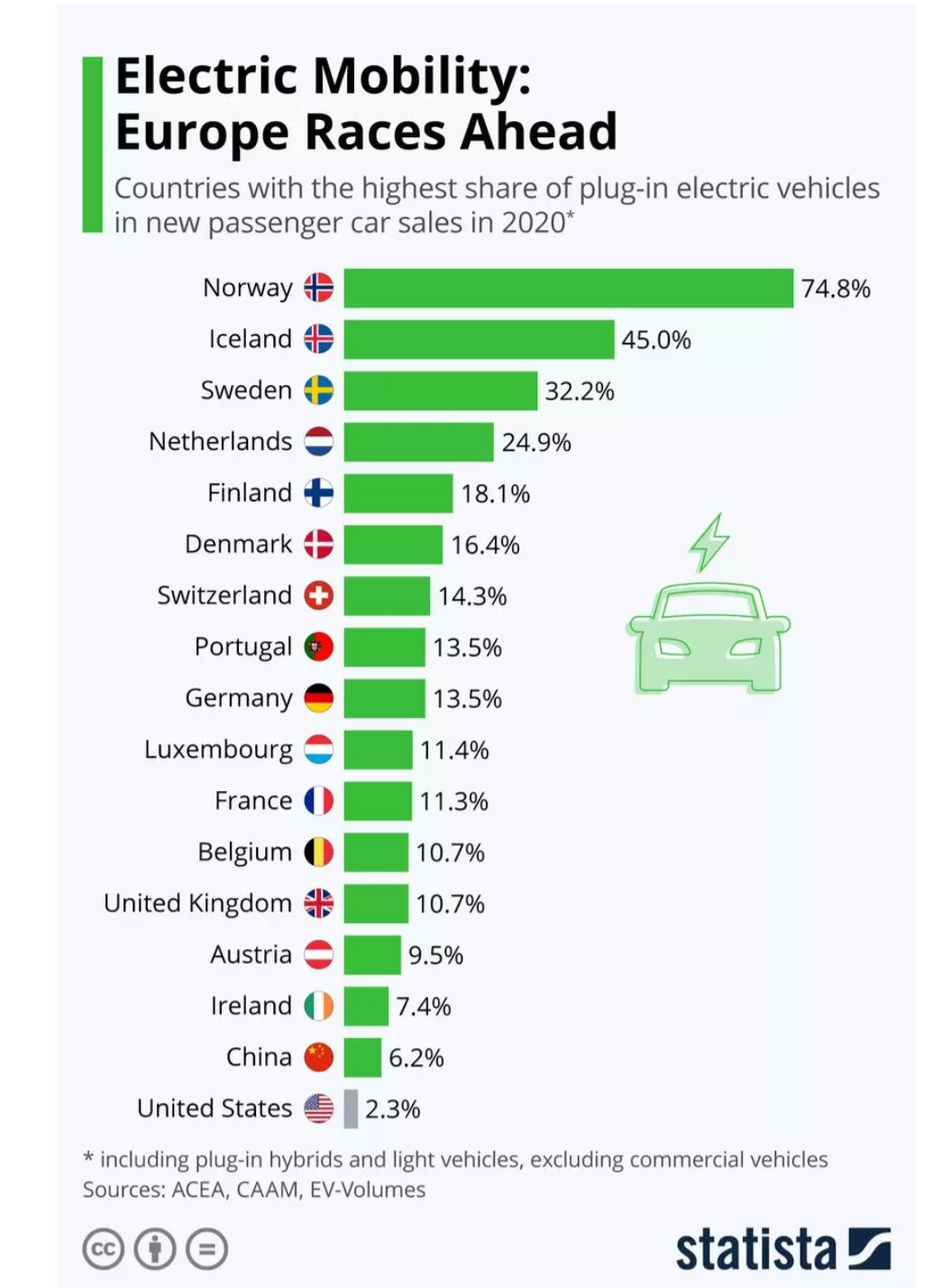 Efforts to go electric are on the rise globally, with countries working tirelessly to see the success of the electric transport transition. According to the World Economy Forum, electric vehicles accounted for 4.2% of light vehicle sales in 2020, almost double 2019's 2.5%. Norway, Iceland, and Sweden are leading the charge, with plug-in electric vehicles accounting for 74.8%, 45%, and 32.2% respectively in 2020.