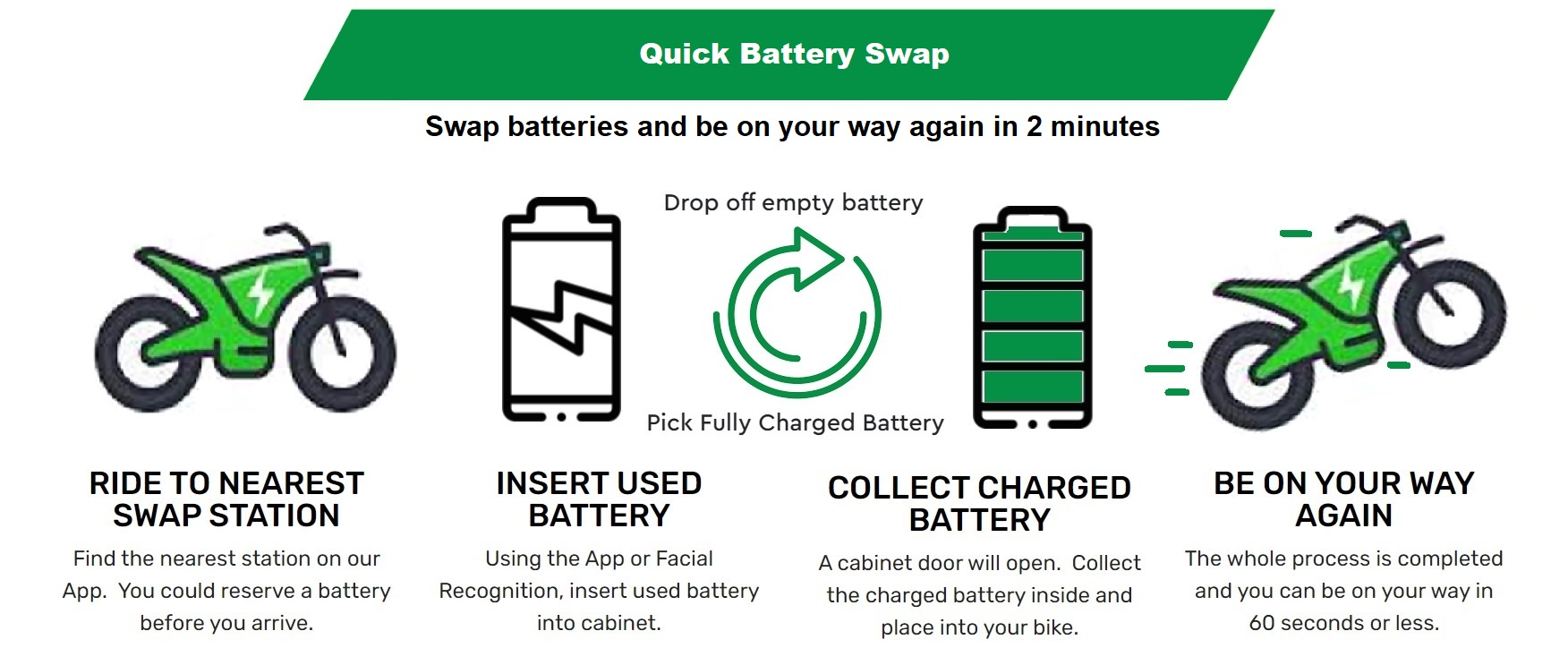 Kiri EV- The company provides swap batteries for E-bikes. Here is a snippet of how to access the services. Locate swap stations around you. Reserve batteries. Bike and battery information and your fingertips. Bikes equipped with Kiri's smart vehicle control unit provides location tracking, anti-theft and remote bike controls. Smart Batteries are constantly monitored and remotely controlled for optimum performance and safety. Smart swap cabinets provide 24-hour automated battery swapping to keep you riding without waiting for batteries to charge.