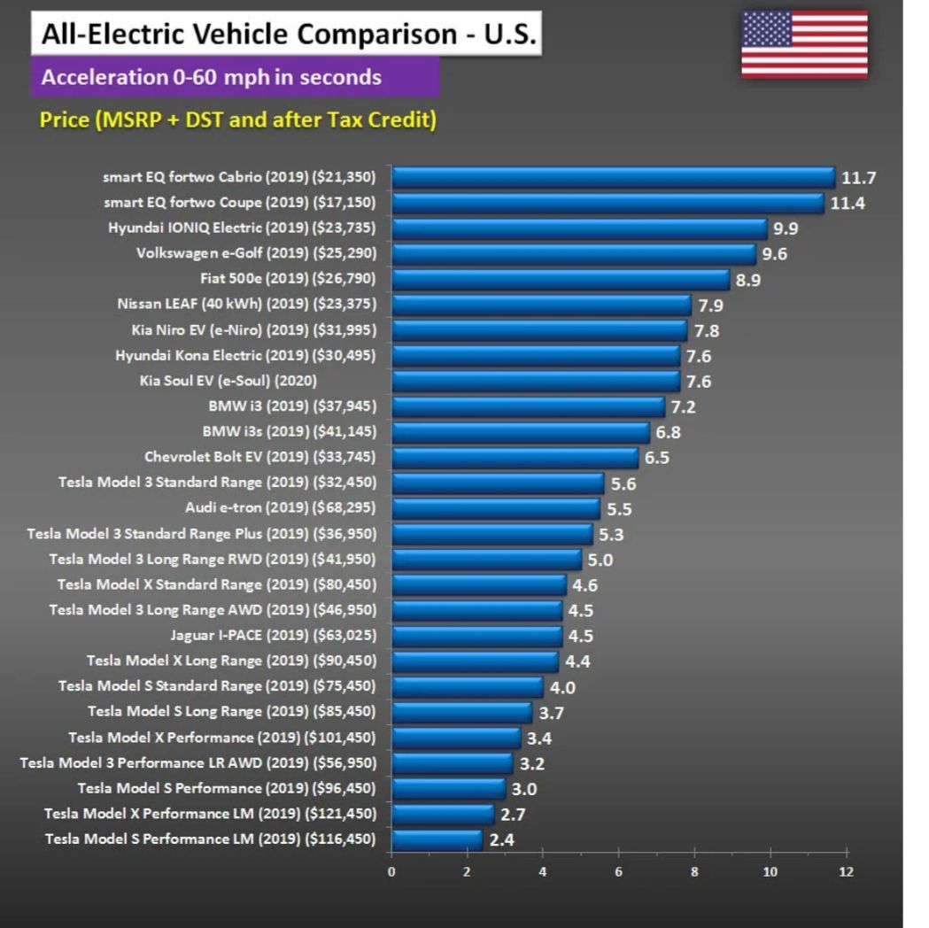 Tesla Models have gone though upgrades, Model S and X offer 0-60 mph times as low as 2.4 seconds. Currently you can order Model 3 and get 3.2 second time for half the price of top model S. The two top non-Tesla models are the Jaguar I-PACE (4.5 seconds) and Audi e-Tron (5.5 seconds).