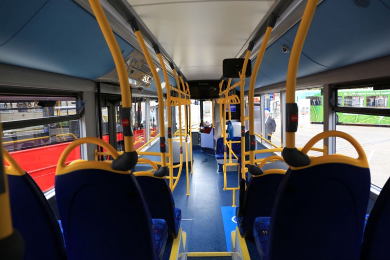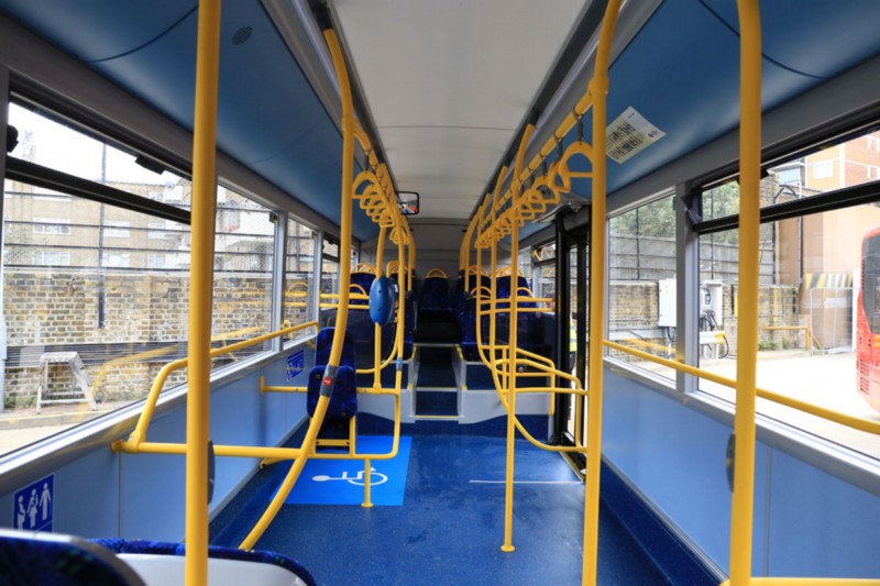 Thanks to its larger wheels, front wheel arch intrusion is more noticeable than on a diesel integral, and the seat mounted on the offside front wheel arch extends into the gangway.Immediately behind the centre doors, two shallow steps take passengers into the rear seated area. With the exception of the front row, a further step is then needed to reach the seats as the aisle here is sunken.Because of their standee specification, the Go-Ahead buses have a huge number of bright yellow vertical and horizontal handrails, and each seat is topped by a yellow grab bar.Passenger seats are fitted, with USB charging points for all of those in the rear section.There is also a section for the wheelchair users therefore accommodating all kind of people.