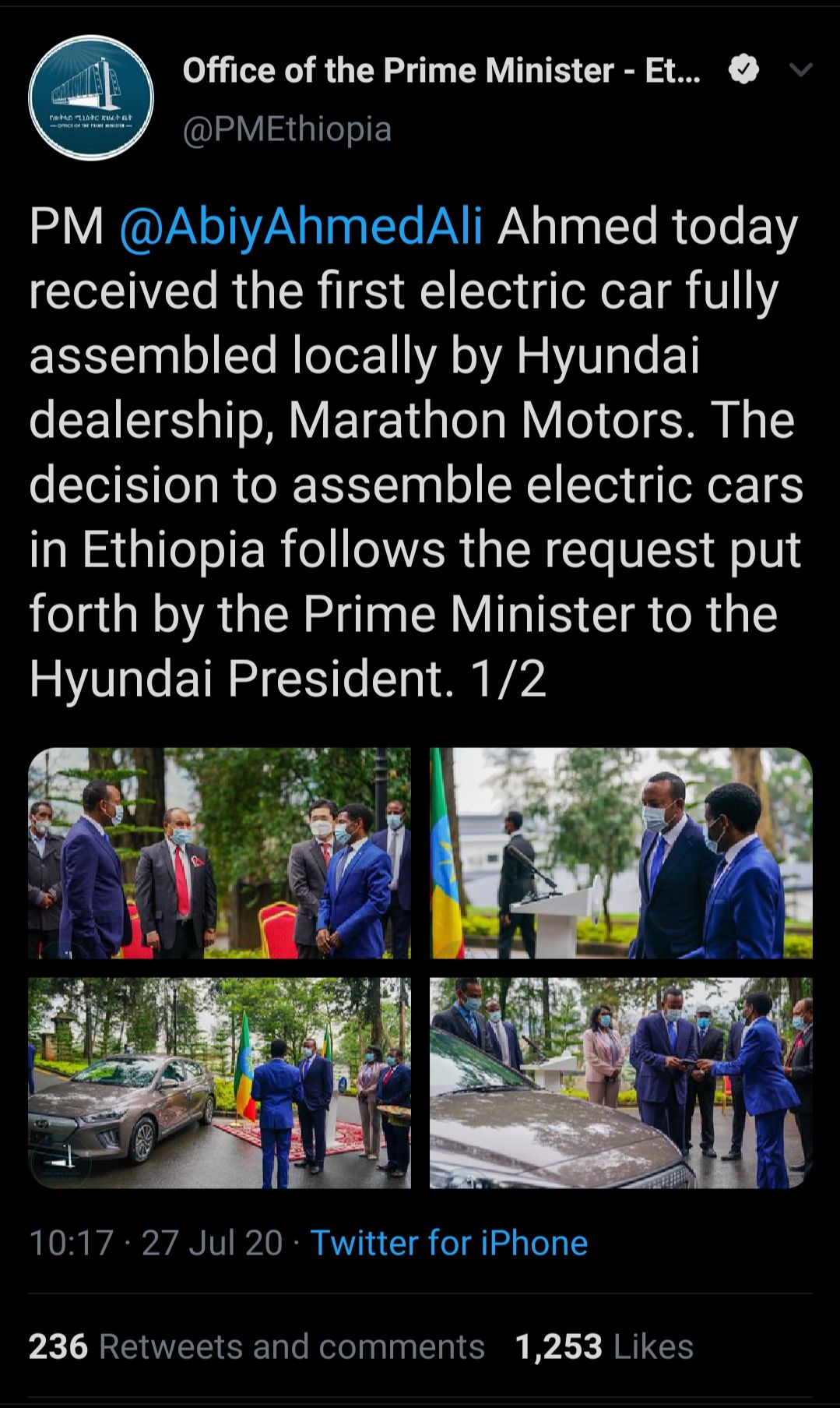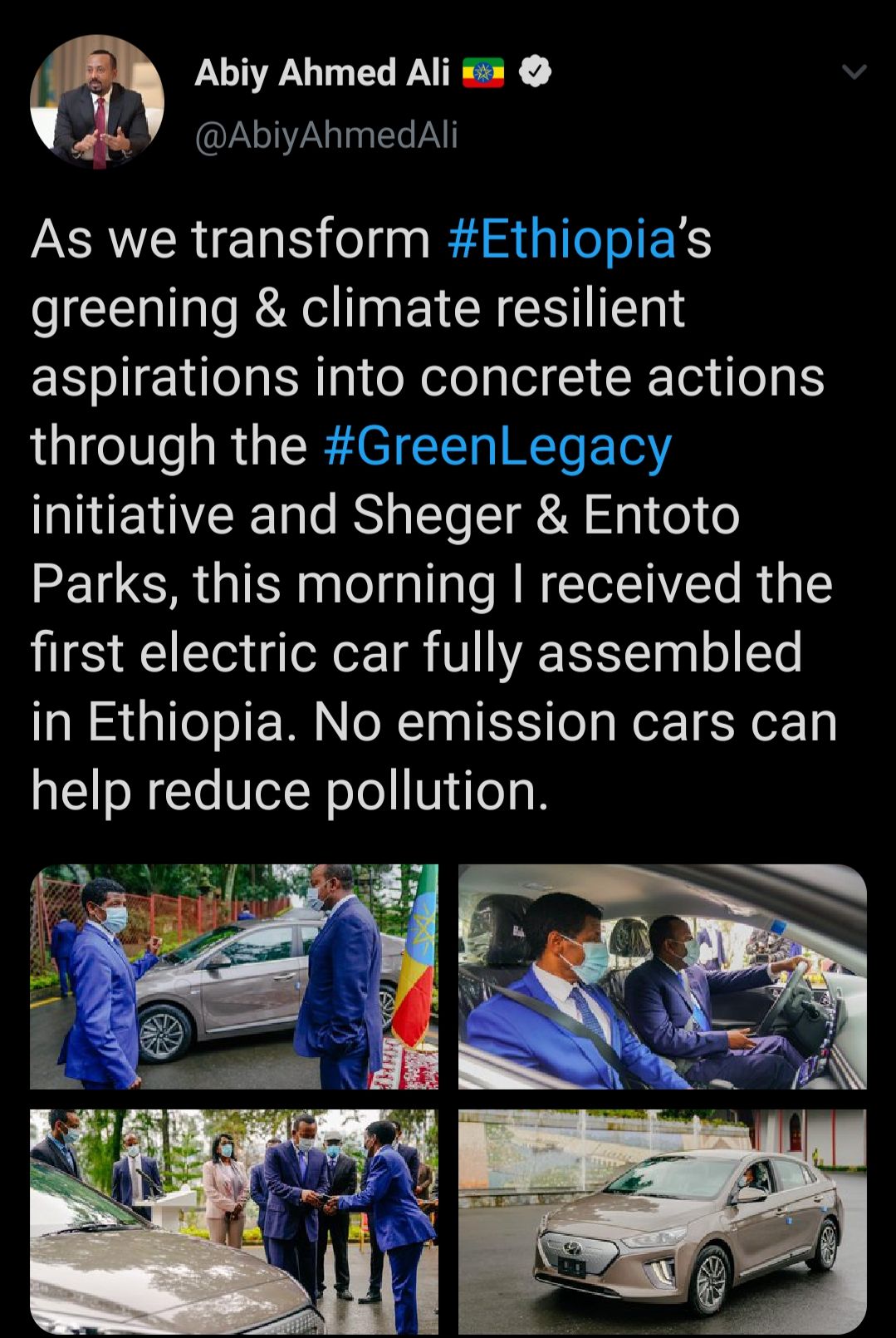 The prime minister Abiv Ahmed said on twitter , the plan is to transform Ethiopia green and climate resilient aspiration into concrete action through the Green Legacy initiative and Sheger and Entoto Parks, the PM received the car on Monday which is the first fully electric car to be assembled in Ethiopia. He also added that no emission can help reduce pollution. The car was delivered by Mr Haile.
