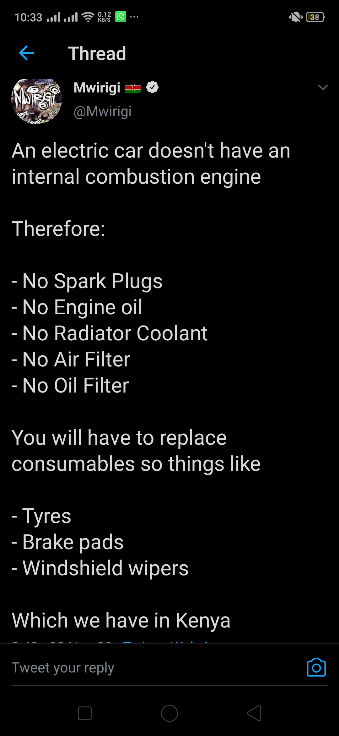 One person answered the worries of most Kenyans by stating all the major differences between EVs and combustion cars therefore answering all the questions that emerges of servicing and spare parts . EVs do not need to be serviced frequently due to the nature of it, they do not use oil which need to change the parts of the cars therefore meaning it will take long before you will need to service your car.