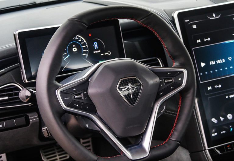 The coupé has a claimed top speed of 124 mph and a 0-62 mph of 4.6 seconds, the top speed is 124 mph. The interior has sport seats with mix leather with alcantara, and the steering wheel has a sporty flat bottom which has a Qiantu logo on the steering wheel, and a large tablet style measuring 15.6 inch touchscreen infotainment system on the dash board, a solar panel on the roof helps to power the car’s electronics and a free-standing digital instrument panel. Main screen seems super sharp with a great graphic of the car. The car’s body is made of aluminium frame and carbon fiber.