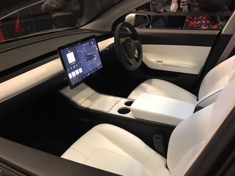 The seats embrace you in a gentle hug that feels a bit more geared for road trip than racetrack. The open- pore wood gives space warmth and the glass roof makes the cabin feel like an atrium. Model 3 comes with a custom sound system which is designed by Tesla.