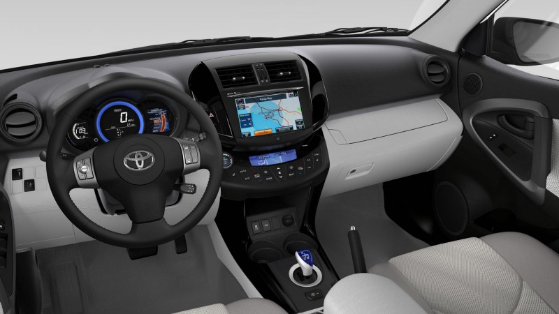 RAV4 EV is a modern car as seen from the driver seat aided by high technology dashboard with large attractive touchscreen. The exterior parts have LED lighting elements, aerodynamic mirrors seems thoroughly modern from the driver seat, aided by a high-tech dashboard with a large, attractive touchscreen. Outside, meanwhile, that old RAV4 body has been spruced up with LED lighting elements, aerodynamic mirrors, a sleeker rear spoiler and a unique EV grille.