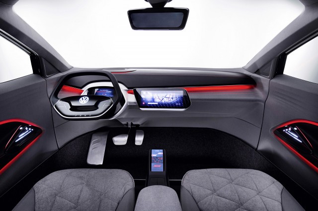 Like the Chevrolet Bolt, the I.D. is a tallish hatchback .The I.D.’s design features are eye like LED headlight surrounds that darken to near invisibility when the car is off then awaken when its turned on. The cluster of LEDs in their centers can selectively light up , even locking. Other lighting features include blue-back lit lower-body accents that pulsate when the I.D. is charging and white-lit door handles that can do a little jig when the vehicle is started.