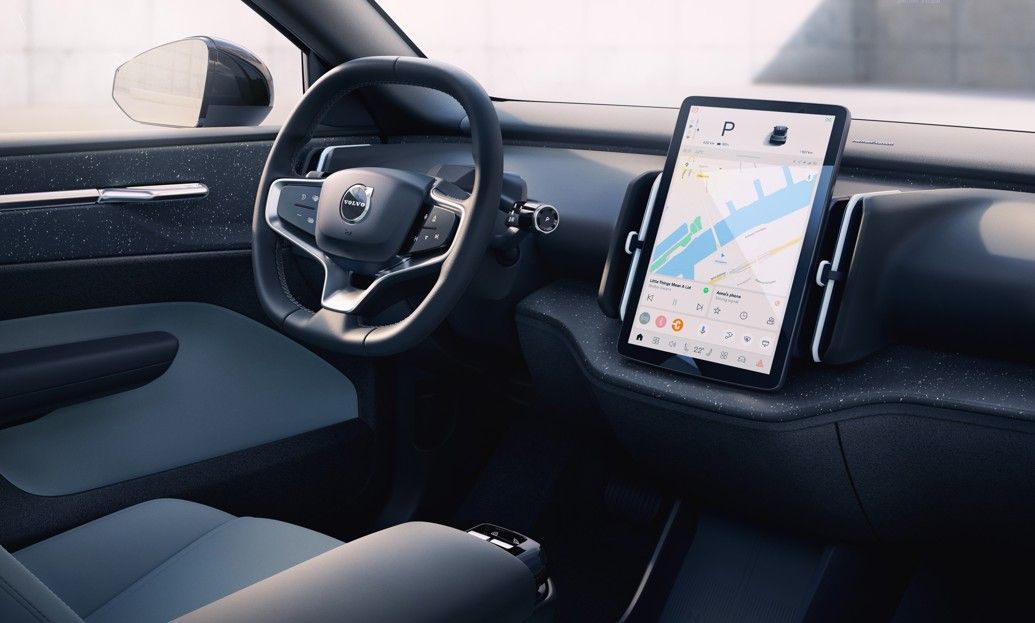 The EX30 features a simple and sustainable interior, which boasts a single 12.3-inch touchscreen powered by Google’s Android Automotive OS. The touchscreen controls most of the car’s functions, including navigation, entertainment, climate, and settings, while a full-width sound bar on the dashboard provides "immersive audio quality". The interior uses recycled and renewable materials, such as wool-blend fabrics, cork vinyl, and wood fibers.